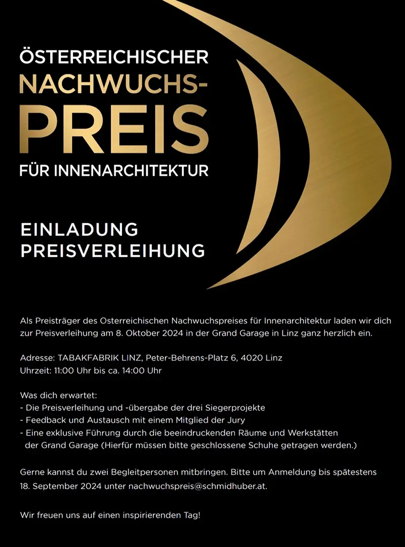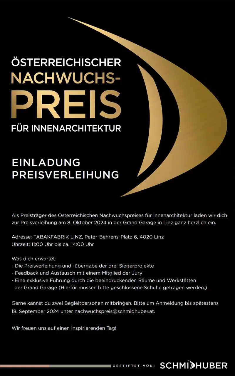 Am 8. Oktober 2024 fand in der Tabakfabrik Linz die feierliche Prämierung des „Österreichischen Nachwuchspreises Innenarchitektur“ statt.