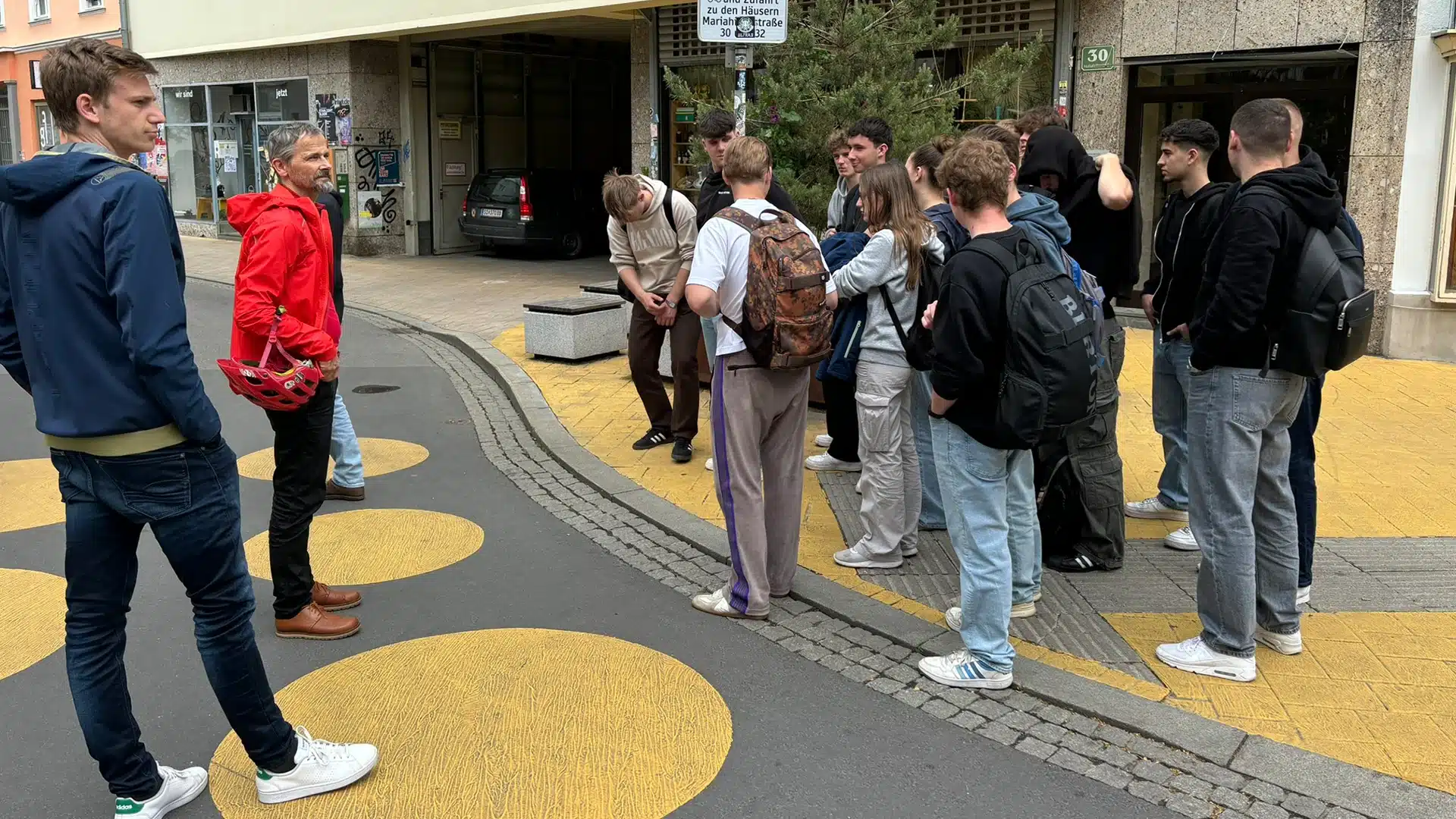 Den Schüler:innen wurde das Entwurfskonzept sowie die Planungs- und Beteiligungsprozesse erläutert. Auch auf die Verkehrserhebung und die Entwürfe zur Verkehrsberuhigung und Verbesserung der Aufenthaltsqualität wurde eingegangen. Dabei wurde den Schüler:innen die konkrete Umsetzung der einzelnen Maßnahmen (wie etwa die Markierung gelber Begegnungslinien oder die Möblierung und Bepflanzung der Zone) präsentiert.