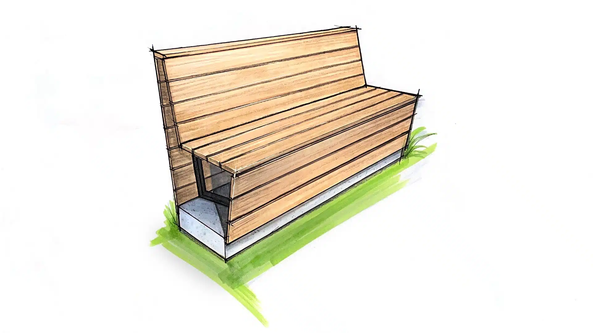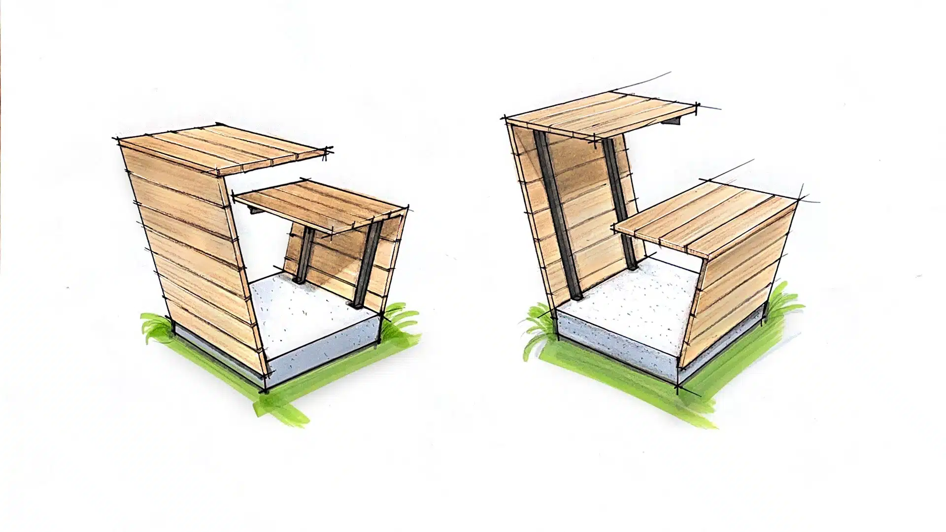 Die Herausforderung: ein ergonomisches Design mit den Materialien Lärche, Stahl und Beton – bewusst reduziert, um kreative Grenzen auszuloten. Die Arbeitszeit war inspirierend und frei, denn der konkrete Ort gab der Gestaltung eine klare Richtung. Auch der Präsentationstag war sehr positiv: Die Jury war interessiert, stellte gezielte Fragen und ermöglichte eine offene Gesprächsatmosphäre.