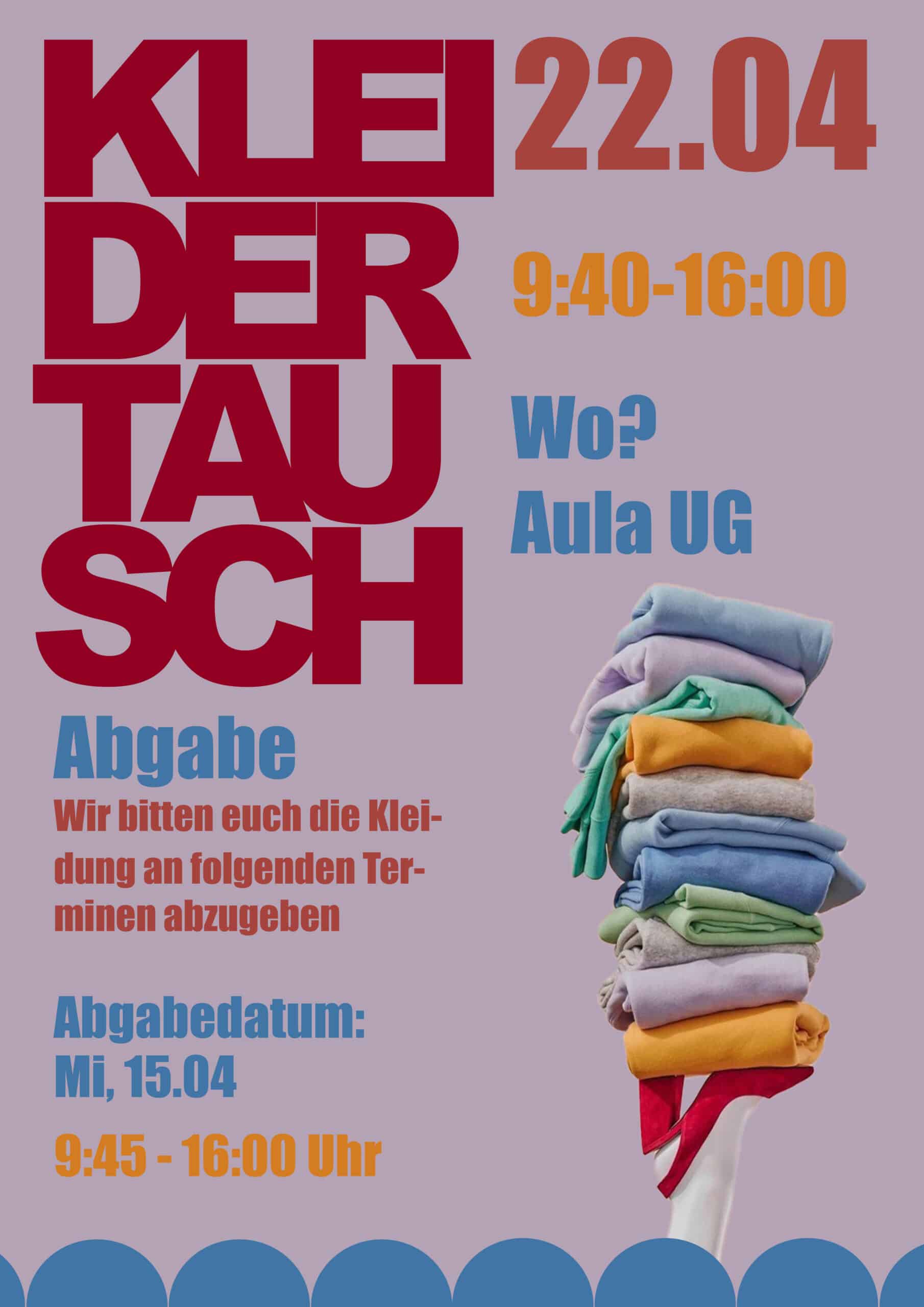 So funktionierts: am Mittwoch, dem 15. April (9:40 – 16:00) kann Kleidung (tragbar und sauber), Accessoires, Schmuck, Schuhe etc. in der Aula (UG) abgegeben werden – am Mittwoch, dem 22. April wird dann geschmökert, gestöbert, probiert (Umkleide vorhanden!) und getauscht.