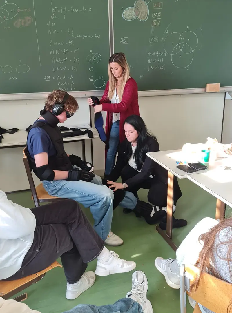 Mithilfe von Simulationsbrillen für verschiedene Erkrankungen, Gehhilfen wie Rollator und Rollstuhl sowie dem Nachempfinden von Einschränkungen wie COPD, Morbus Parkinson oder Wasser in den Beinen konnten die Schüler:innen hautnah erleben, welchen Herausforderungen Menschen mit Beeinträchtigungen im Alltag begegnen.